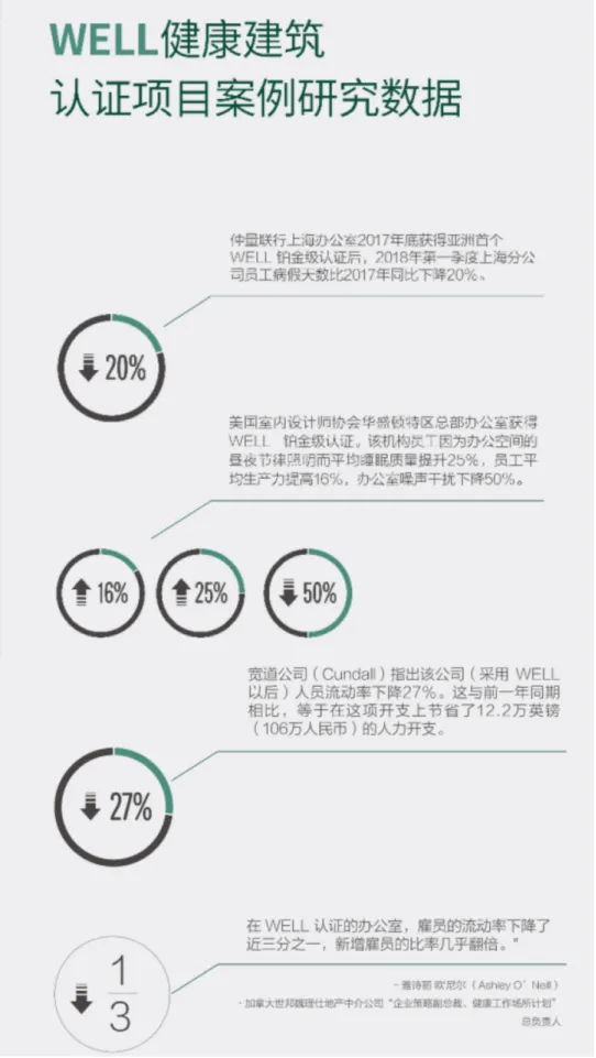 The employees of WELL Certification Office reported that a healthy working environment has brought them considerable happiness. Research has shown that employees working in WELL healthy building spaces experience an overall 10% improvement in health status, a 5% decrease in absenteeism, a 5% improvement in work performance, a 6% increase in optimal working hours, a 24% decrease in sick attendance, a 60% decrease in medical expenses, and a 20% decrease in hospital utilization. Enterprises that utilize WELL healthy buildings also demonstrate outstanding performance in terms of venue rental, employee retention rate, and ESG.