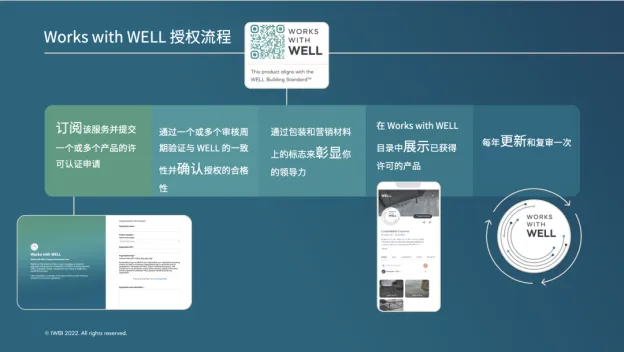 Works with WELL (hereinafter referred to as WwW) is the latest product licensing program launched by IWBI, aimed at enabling manufacturers to demonstrate the consistency of their products with the provisions of WELL building standards, providing a visual basis for their health contributions in creating indoor environments. Manufacturers select products that require licensing and submit materials for these products (such as product testing reports, product descriptions, etc.). IWBI will review the materials submitted by manufacturers to verify whether the products comply with the terms of WELL Health Building Standards. Products reviewed by IWBI will be displayed on a dedicated page and linked to product details on the IWBI official website, maximizing the association between WwW products and WELL. The product can also use its WwW logo and exclusive QR code on its packaging to highlight its health attributes.